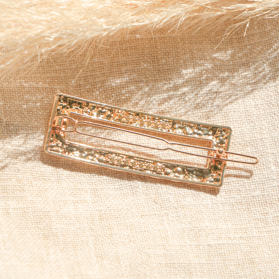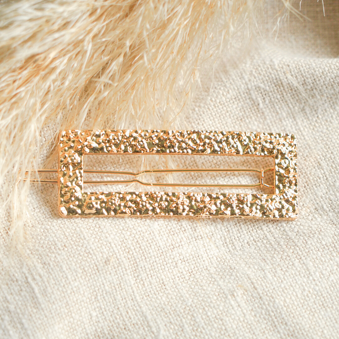 Barrette en métal doré modèle « Cléo ». Apportez une touche raffinée à vos coiffures avec la barrette en métal doré Cléo, un accessoire artisanal symbole de féminité. Inspirée par Cléopâtre, légendaire reine d’Égypte, cette barrette illuminera vos cheveux d’un éclat unique du matin jusqu’au soir.