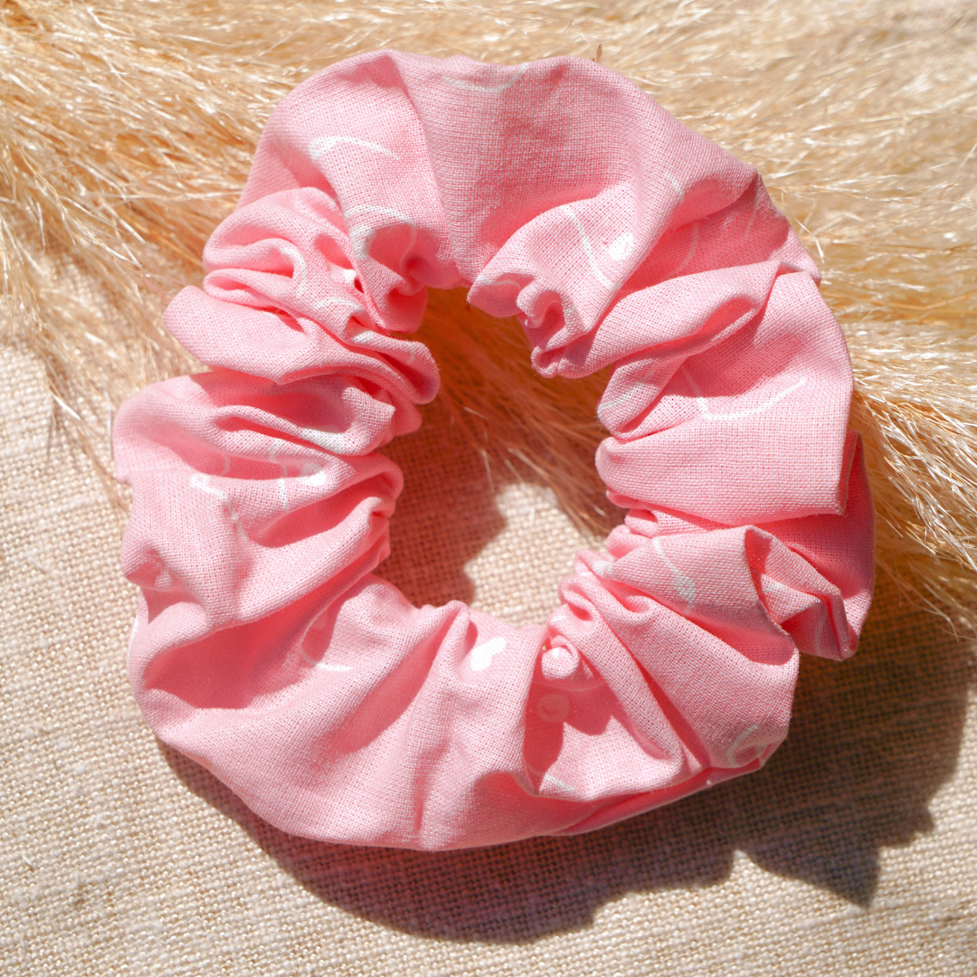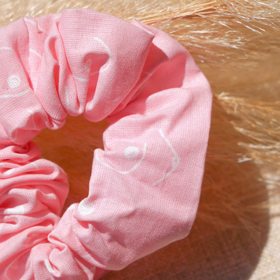 Chouchou en tissu biologique, modèle ‘Boobies’. Le chouchou Boobies : un accessoire engagé et solidaire. Conçu pour soutenir la Lutte contre le cancer du sein, ce chouchou rose célèbre l’univers féminin avec élégance et sensibilité.