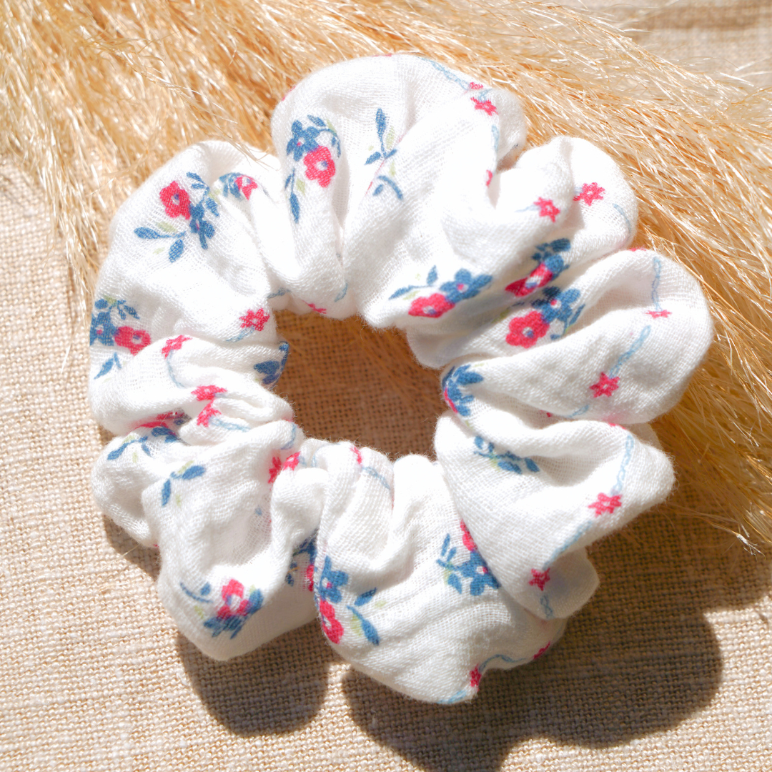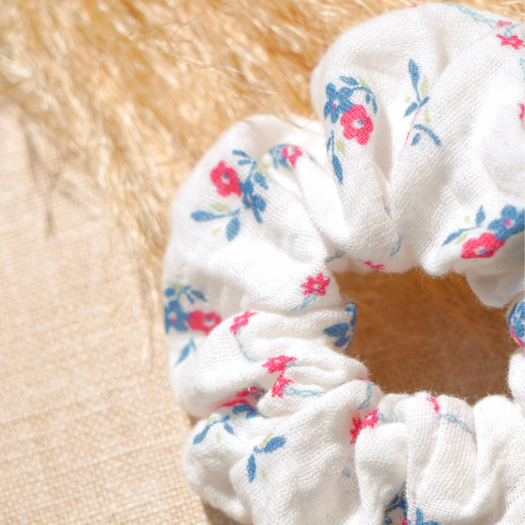 Chouchou en tissu biologique, modèle ‘Myosotis’. Le chouchou Myosotis : douceur et élégance au quotidien. Confectionné dans un tissu écologique en gaze de coton, le chouchou Myosotis est l’un des modèles les plus doux et confortables du studio. Fabriqué à la main avec soin à Valence, tout comme son petit frère le Mini-Chou Myosotis, il est parfait pour celles qui recherchent un accessoire pour cheveux respectueux et agréable à porter.